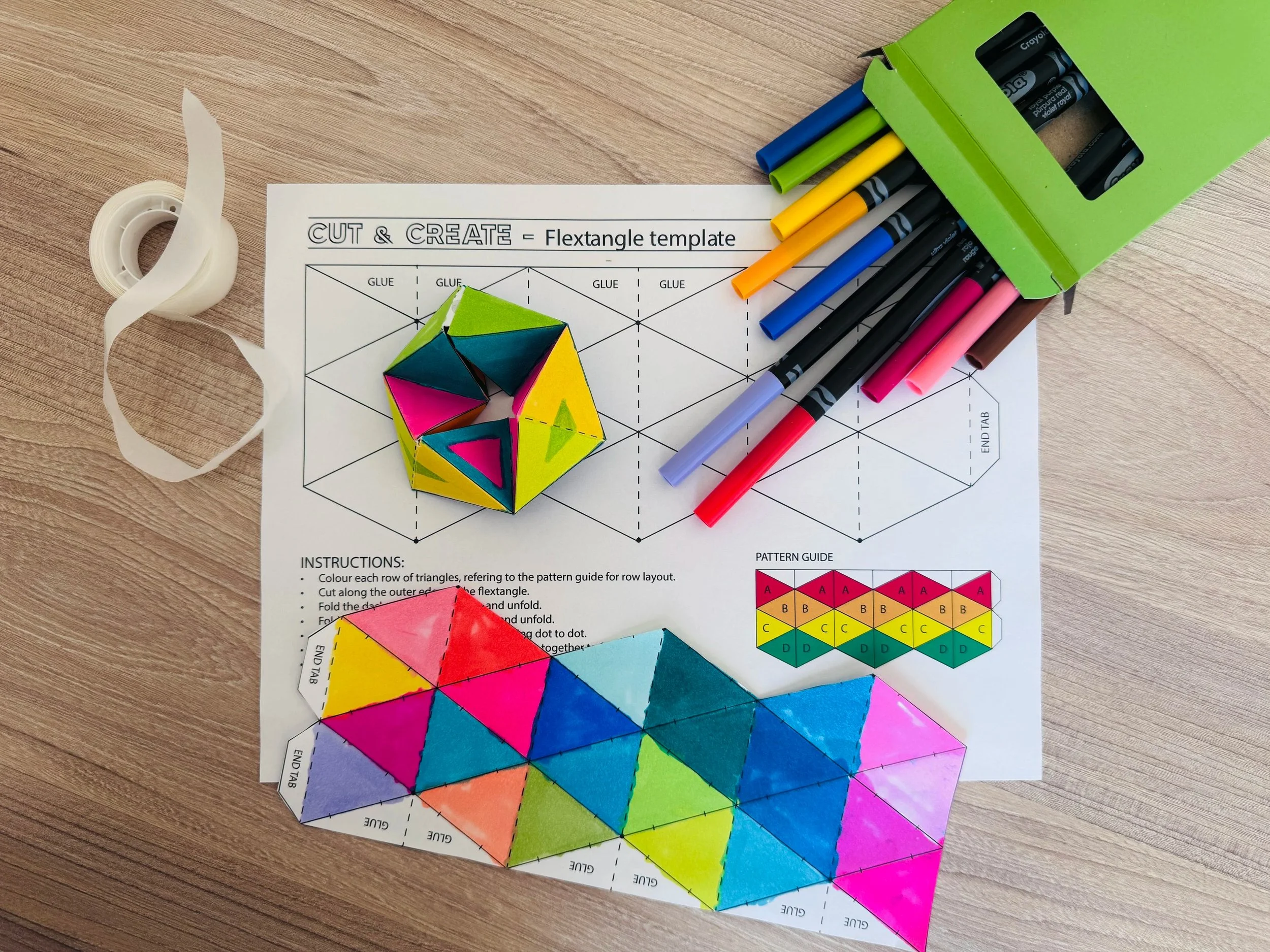 Start by bringing your designs to life with vibrant colors and playful patterns. Then fold and assemble your creation into a mesmerizing Flextangle fidget toy you can twist, turn, and play with again and again. Watch your colorful designs come to life in motion!